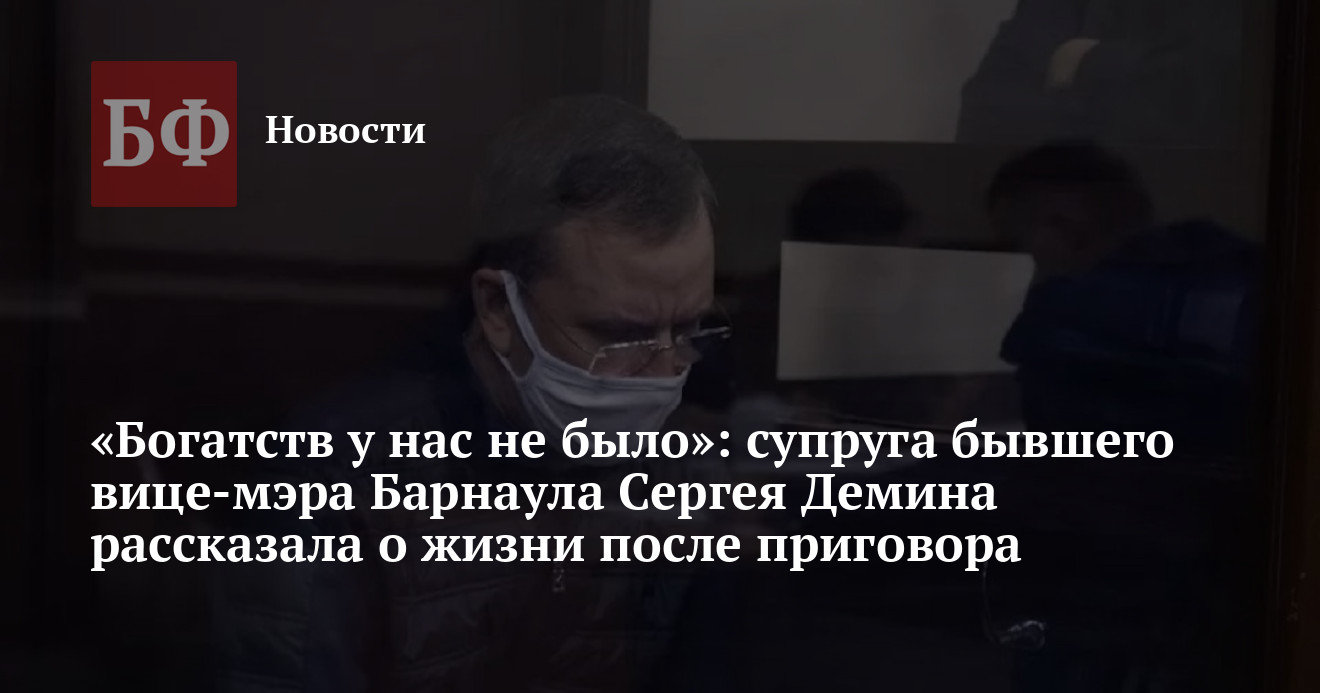 Жена осужденного за коррупцию экс-замглавы Барнаула по строительству Сергея Демина Ольга дала откровенное интервью «Комсомольской правде», в котором рассказала о своей реакции на обвинительный приговор и отношении к ходу судебного процесса. Она считает, что ее мужа незаслуженно осудили на 9 лет колонии, поскольку он не был замешан в противозаконных схемах и вообще он порядочный человек, который не идет на сделки с совестью. Со слов женщины, их семья никогда не была богатой и не жила в роскоши.