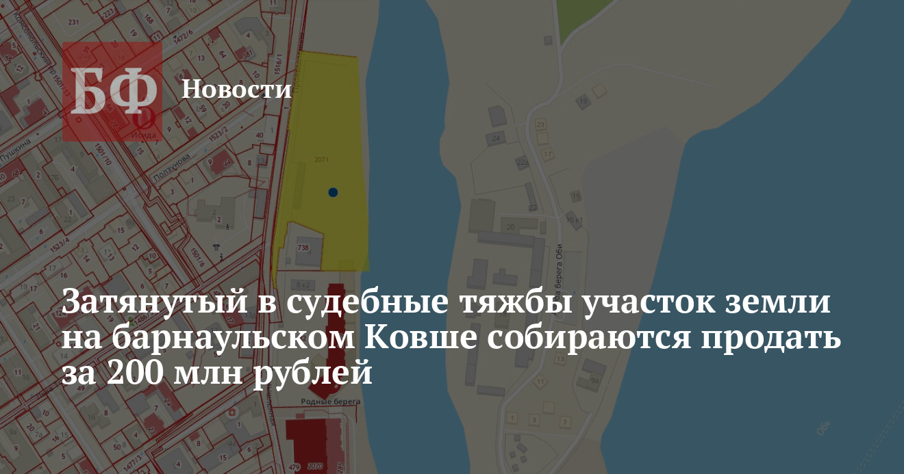 В акватории барнаульского Ковша (старый Речпорт) продают участок под застройку. Проект жилого комплекса для него у продавца уже есть, однако дело осложняется затянувшимися судебными тяжбами о праве собственности на эту площадку. Тем не менее, как пишет «Толк», собственник просит за эту землю около 200 млн рублей.