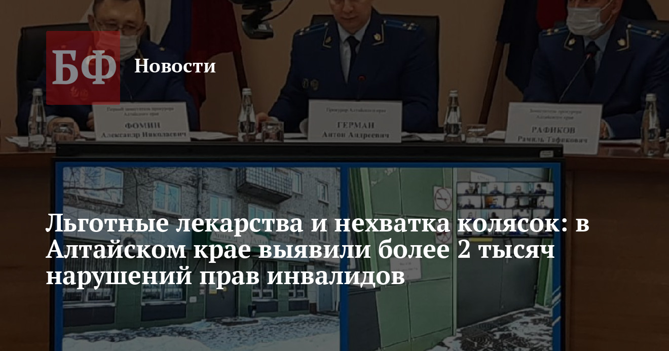 Прокурор Алтайского края Антон Герман провел заседание коллегии, на котором обсудили, как в регионе соблюдаются социальные права инвалидов. Результаты проверки ведомства показали, что в крае выявлено более 2 тысяч нарушений, которые касаются самых разных сфер жизни: обеспечения лекарствами, расходниками, колясками, соблюдения трудовых прав, доступности среды и т.д. По двум из них уже возбудили уголовные дела.