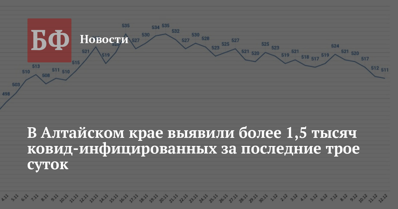 С 10 по 12 декабря в Алтайском крае было зарегистрировано 1540 новых случаев заболевания коронавирусной инфекцией. Таким образом, общее число полученных в регионе положительных тестов на ковид составляет 110 793, в том числе — у 9424 детей. При этом за минувшие трое суток в крае скончалось 82 пациента с COVID-19. Всего же за время пандемии вирус унес жизни 7550 человек.