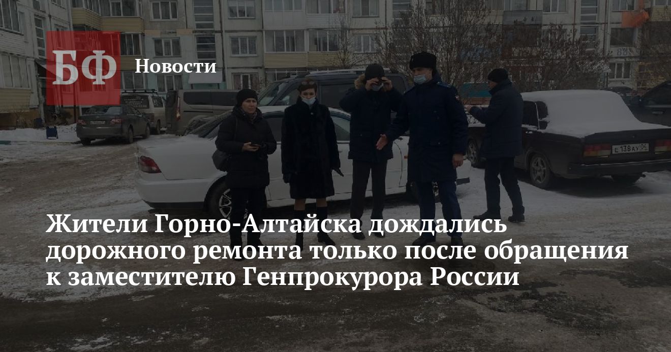 По данным прокуратуры Республики Алтай, в ноябре граждане обратились с коллективным заявлением в приемную президента к заместителю генпрокурора РФ Дмитрию Демешину, сообщив, что городские власти нарушают их права. Органы прокуратуры республики тут же провели проверку и установили, что дорожное полотно, расположенное между домами №№ 84/1, 86, 88, 90 по проспекту Коммунистическому в Горно-Алтайске, не соответствует требованиям стандартов — там имеются выбоины, ямы и неровности. В ведомстве пришли к выводу, что это стало возможным в связи с ненадлежащим выполнением своих обязанностей МКУ «Городское хозяйство и лесничество», АО «Горно-Алтайское ЖКХ», а также отсутствием должного контроля со стороны администрации Горно-Алтайска.