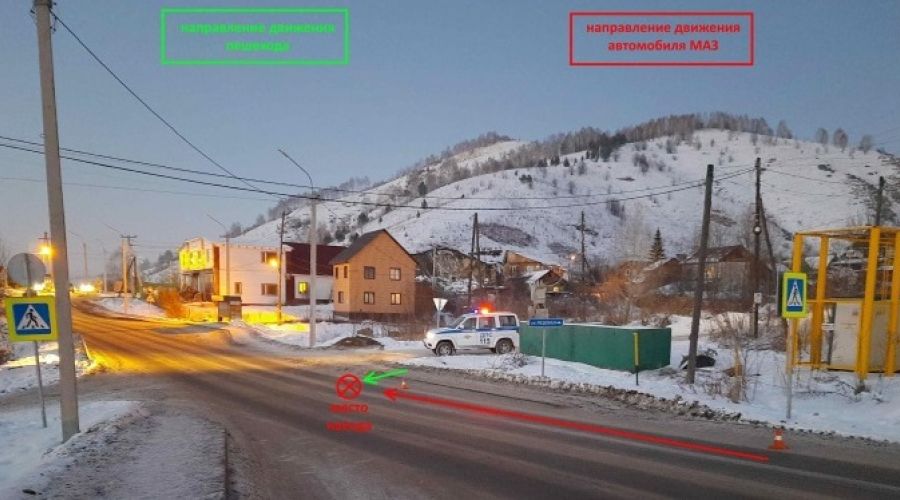 Сотрудники полиции проводят проверку по факту ДТП, которое накануне случилось в Горно-Алтайске. Пожилой мужчина решил перейти дорогу в неположенном месте и был сбит грузовиком — его тут уже увезли в больницу. В отношении пешехода уже составили протокол.