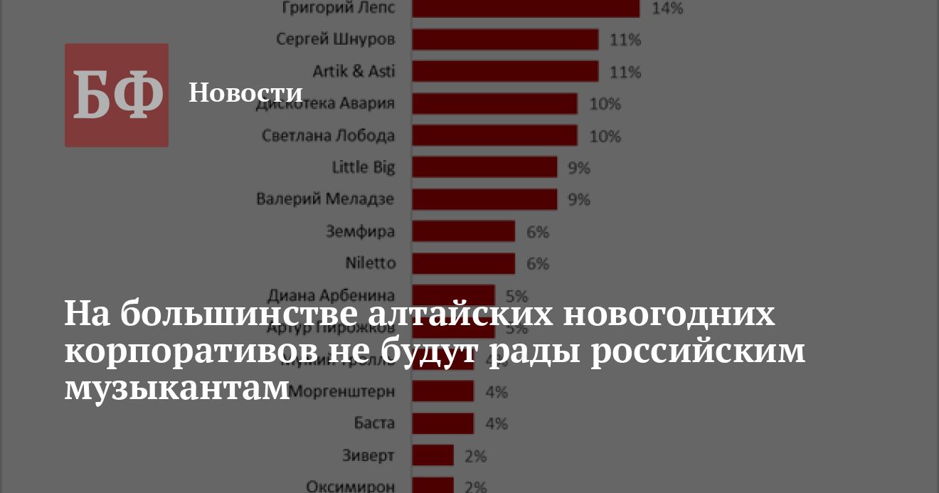 Вторым по популярности ответом стала группа «Би-2» — ее выбрали 17% участников опроса. Чуть менее желанным гостем на алтайских корпоративах оказались «Руки вверх» — их хотели бы видеть 16% опрошенных. 14% респондентов положительно отнеслись к возможности выступления Григория Лепса. По 11% поддержки набрали Сергей Шнуров и коллектив Artik & Asti, а Светлана Лобода и «Дискотека авария» — по 10%. Поклонников творчества Валерия Меладзе неожиданно оказалось примерно столько же, сколько и у группы Little Big — по 9%. Земфиру и Niletto на своем корпоративе хотели бы видеть по 6% опрошенных, Диану Арбенину и Артура Пирожкова — по 5%. По 4% опрошенных были бы не против провести корпоратив с Бастой, «Мумий Троллем» или Моргенштерном. Оксимирон, Елка, Полина Гагарина, Вера Брежнева и «Зиверт» набрали всего по 2%. А вот рэпера Скриптонита в Алтайском крае, похоже, вообще не хотят видеть на корпоративах — его кандидатура не набрала ни одного процента.