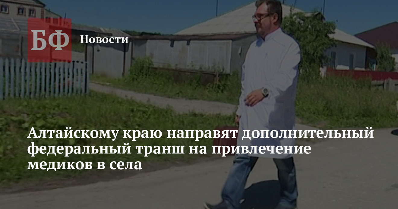 Правительство РФ в 2022 году направит дополнительные средства на специальные выплаты медработникам, которые соглашаются работать в малых населенных пунктах. Получателями траншей станут четыре субъекта РФ, которые наиболее в этом нуждаются, сообщил премьер-министр России Михаил Мишустин на заседании Координационного совета по борьбе с распространением новой коронавирусной инфекции. Как сказано на сайте федерального кабмина, среди «бенефициаров» этого решения оказался и Алтайский край.