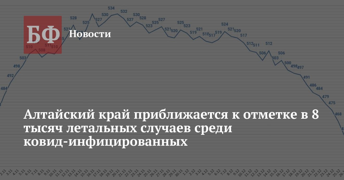 Из 441 нового случая 139 выявили в Барнауле, 44 — среди жителей Бийска, 35 — в Рубцовске, 22 — в Заринске, по 14 — в Камне-на-Оби и Новоалтайске, по 11 — в Змеиногорском и Смоленском районах, по девять — в Топчихинском и Целинном районах, по восемь — в Алтайском, Косихинском, Ребрихинском и Шипуновском районах, семь — в Бийском районе, по шесть — в Алейске, Локтевском и Тальменском районах, по пять — в ЗАТО Сибирском, Калманском, Павловском, Первомайском и Третьяковском районах, по четыре — в Волчихинском, Тогульском и Троицком районах, по три — в Баевском, Ельцовском, Кулундинском, Мамонтовском и Хабарском районах, по два — в Заринском, Каменском, Крутихинском, Немекцом национальном, Петропавловском и Усть-Калманском районах, по одному — в Славгороде, Алейском, Благовещенском, Залесовском, Зональном, Ключевском, Красногорском, Родинском, Солтонском, Табунском, Угловском и Чарышском районах. С учетом этих цифр за все время пандемии в Алтайском крае заразились 118 547 человек, выздоровели — 98 470. Умер 7981 пациент, в том числе 27 — за последние сутки. Из них 6530 скончались непосредственно от COVID-19, а 1451 — по иным причинам.