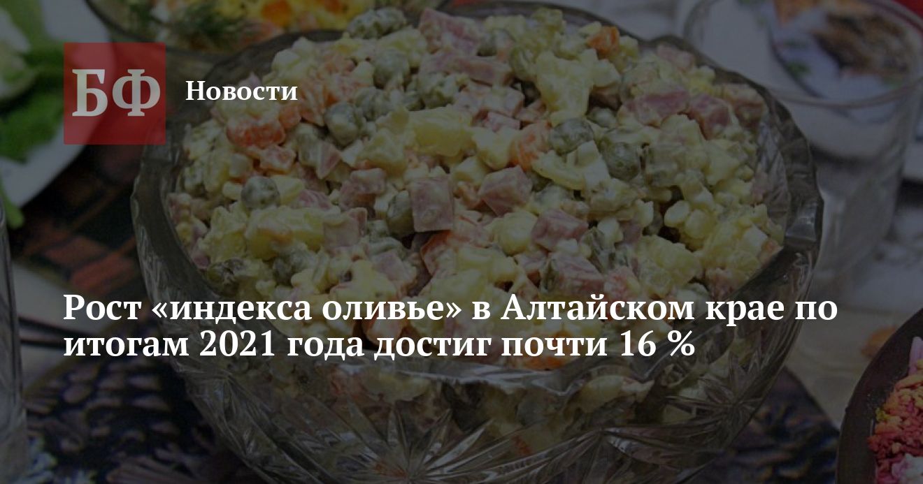 Расчет производился на основе цен на ингредиенты праздничного блюда, приведенные в «индексе оливье-2020». Также сравнивались данные Алтайкрайстата о потребительских ценах на товары на конец декабря 2020 и 2021 годов. Цена на майонез была взята из публикации о росте стоимости соуса в Сибири. Помимо этого, была использована федеральная динамика роста стоимости отдельных продуктов, выпадающих из мониторинга органов статистики, которую приводили «Известия». По данным издания, в целом по стране приготовление салата на четырех человек стало дороже на 15% по сравнению с 2020 годом и составило 416 рублей. При этом отдельные составляющие подорожали в России на десятки процентов.