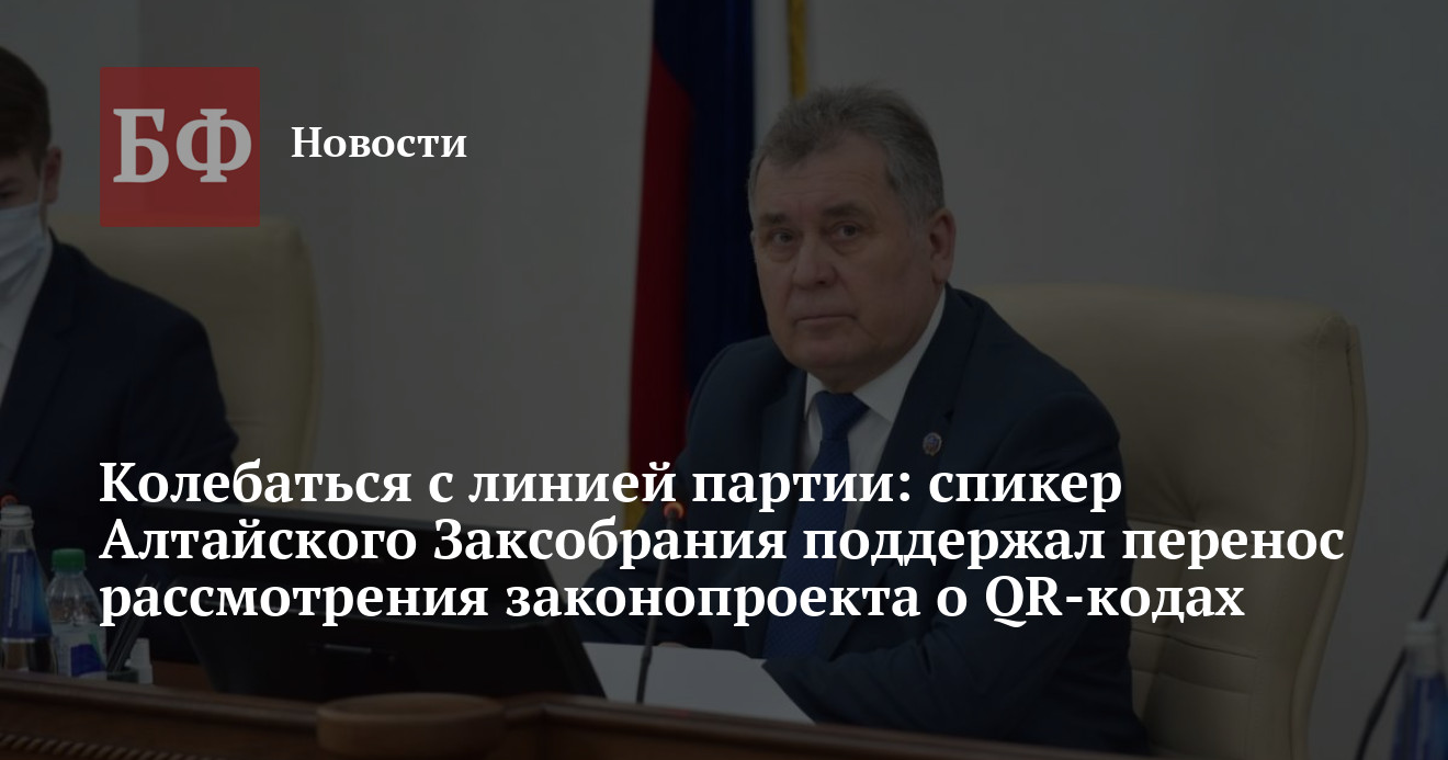 Председатель Алтайского Заксобрания Александр Романенко заявил, что решение его коллег-единороссов из Госдумы отложить рассмотрение законопроекта о QR-кодах — правильное. Его слова приводит сайт краевого отделения ЕР. При этом нельзя не отметить, что позицию спикера некоторые наблюдатели посчитали непоследовательной и невнятной, учитывая его прошлые выступления. Так, ранее Романенко однозначно заявлял о поддержке этой инициативы, настаивал на ее скорейшем принятии и резко критиковал депутатов, голосовавших против.