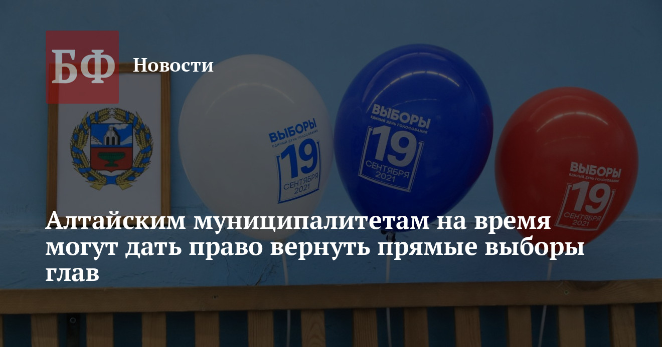 Комитет Алтайского Заксобрания по правовой политике и местному самоуправлению разрабатывает законопроект, который временно позволит муниципалитетам края либо назначать глав по результатам прямых выборов, либо из числа местных депутатов. или же по итогам конкурса Об идее дать власти на местах возможность выбора сообщается на сайте регионального парламента. Правда, эта «вольница» пока планируется лишь на ближайшие шесть лет, пока не все муниципалитеты перешли на формат муниципальных округов.