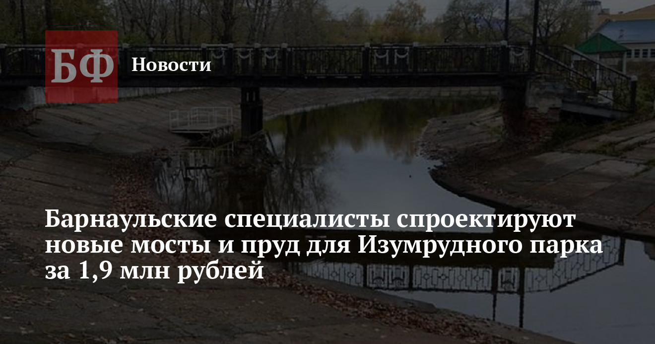 Подведены результаты аукциона по определению подрядчика, который составит проектную документацию на благоустройство пруда и мостов в Изумрудном парке Барнаула. По данным портала Госзакупок, в конкурсе победила местная фирма. Она получит контракт на 1,9 млн рублей.