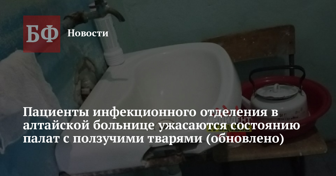 Пациентка инфекционного отделения Волчихинской ЦРБ рассказала об ужасном убранстве помещений с неприятными «соседями». В сообществе «Инцидент Рубцовск» «ВКонтакте» она сообщила, что жалобы не дают никаких результатов. В самом медучреждении ИА «Банкфакс» подтвердили, что состояние палат действительно вызывает вопросы у граждан, но о планах на ремонт ничего сказать не смогли. Редакция обратилась с вопросами к краевому Минздраву.