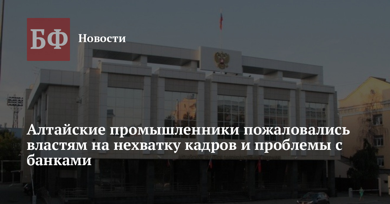 Представители промышленного сектора Алтайского края пожаловались депутатам Алтайского Заксобрания и представителям регионального правительства на проблемы в их отрасли. По их словам, кадров стало остро не хватать, а банковские кредиты якобы уже давно не выступают в роли инструментов для развития предприятий. В то же время власти в рамках организованного круглого стола рассказали им о своей концепции развития промсектора, которая, похоже, лишь по касательной задевает вопросы, поднятые представителями отрасли. О результатах встречи сообщается на сайте АКЗС.