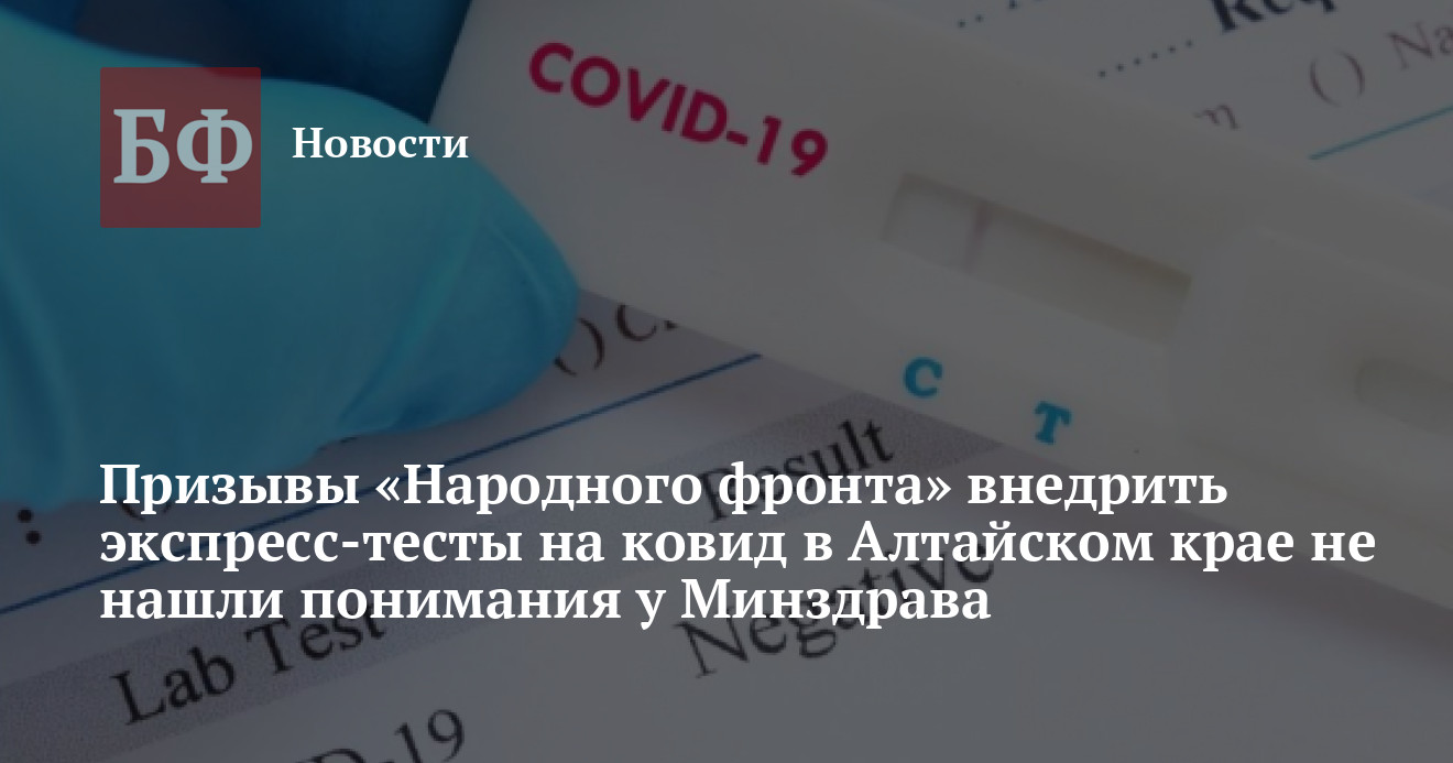 Представители отделения «Общероссийского народного фронта» в Алтайском крае уже полтора года безуспешно призывают региональный Минздрав обеспечить широкое проведение экспресс-тестирования населения на ковид. Как сообщают «фронтовики», такие системы уже давно рекомендованы для использования Минздравом РФ. В ближайшее время в регионы планируется поставить большую партию этих тестов, и в ОНФ надеются, что Алтайский край не станет от них отказываться.
