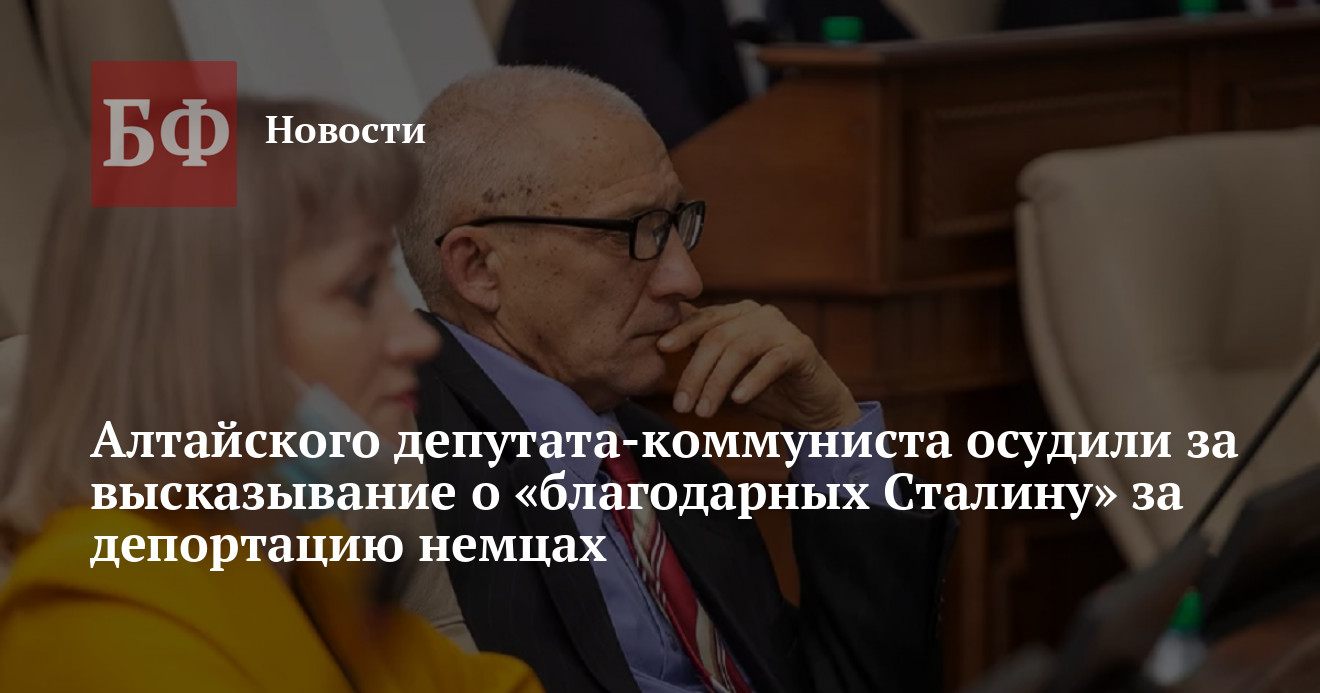 Руководителя центра культурно-делового сотрудничества «Немцы Алтая», вице-президента международного союза немецкой культуры Георгия Классена возмутили высказывания депутата Алтайского Заксобрания от КПРФ Михаила Зайцева о перемещении народов периода ВОВ. Народный избранник на последней сессии заявил, что российские немцы должны быть благодарны Сталину за депортацию. По мнению общественника, позиция парламентария говорит о его уровне культуры и неграмотности. Поведение коммуниста также может рассмотреть мандатная комиссия АКЗС, пишет «Политсибру».