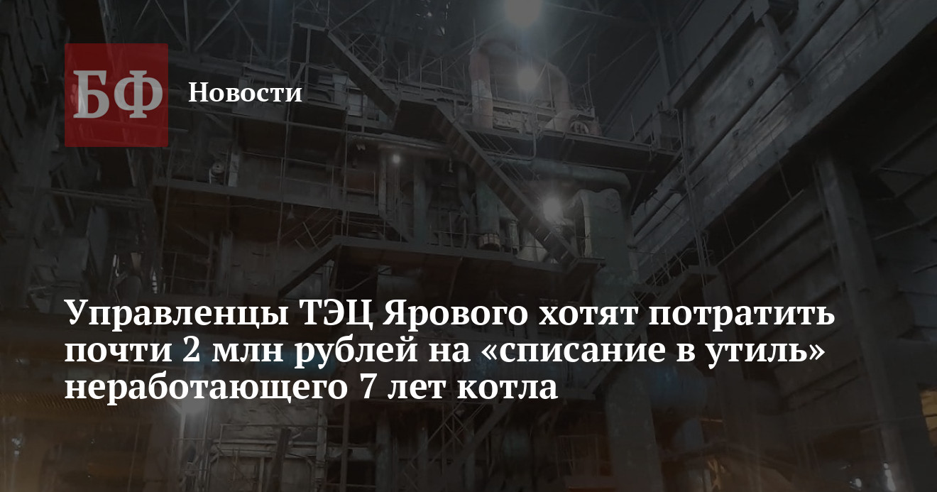 Обслуживающее ТЭЦ Ярового МУП «ЯТЭК» объявило тендер на демонтаж котла № 8, который был выведен из эксплуатации несколько лет назад. По данным портала Госзакупок, на эти цели планируется потратить немногим менее 2 млн рублей. Вместе с тем администрация города более чем за 8 млн рублей готова заказать разработку технико-экономического обоснования системы теплоснабжения муниципалитета, которая обсуждалась во время визита в Яровое делегации правительства Алтайского края в конце прошлого года.
