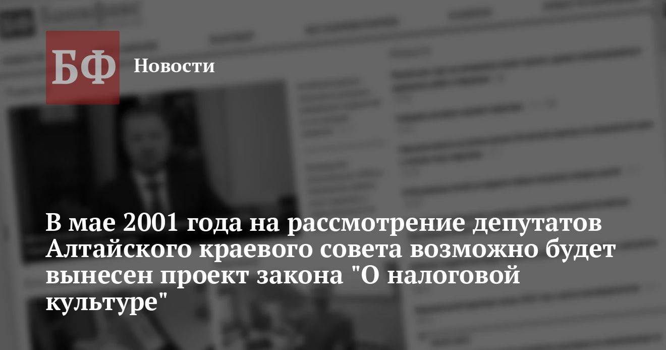 Как заявил руководитель Управления Министерства РФ по налогам и сборам по Алтайскому краю Лев Коршунов, возможно в мае депутаты Алтайского краевого Совета народных депутатов рассмотрят проект закона «О налоговой культуре», разработанный краевым управлением МНС РФ. Коршунов отметил, что алтайские налоговики первыми в России выступили с такой законодательной инициативой.