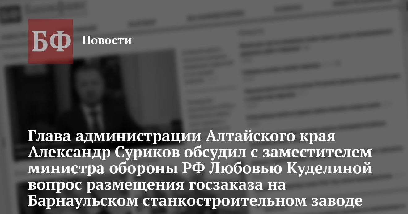 Кроме того, Александр Суриков встретился с заместителем министра обороны РФ Любовью Куделиной, обсудив с ней вопрос возможного размещения госзаказа на Барнаульском станкостроительном заводе. По данным пресс-службы, в беседе Сурикова и Куделиной речь шла перспективе дальнейшего производства на заводе военных патронов, которые по своим характеристикам не имеют аналогов в России и за рубежом.