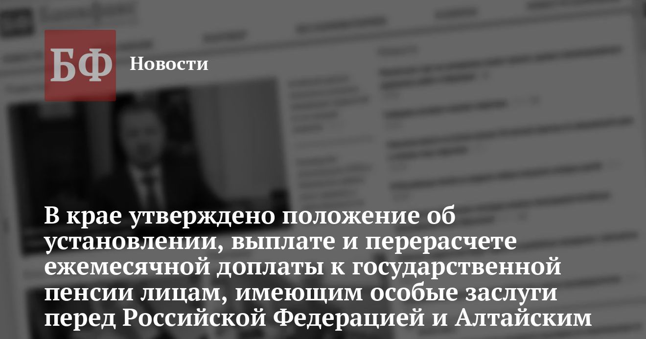 В соответствии с данным положением, доплата устанавливается ко всем видам пенсий лицам удостоенным званий Героя СоцТруда, почетных званий народных, заслуженных работников СССР, РСФСР, РФ, лауреатов Государственных или Ленинских премий, а также Почетным гражданам Алтайского края, лицам, награжденным орденами Трудовой Славы трех степеней, орденом Ленина, матерям-героиням и другим категориям пенсионеров.