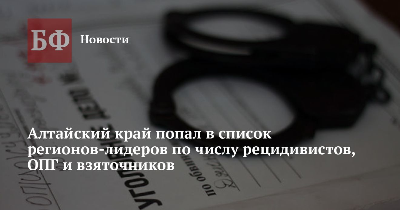 Генпрокуратура РФ представила рейтинг преступности регионов за 2021 год. Места субъектов ранжировались по ряду показателей, в том числе по общему количеству выявленных преступлений, динамике роста, а также отдельным видам правонарушений. Алтайский край оказался в лидерах среди регионов России сразу по нескольким из них. В частности край отметился большим числом взяточников, рецидивистов, организованных преступных групп и наркоторговцев.