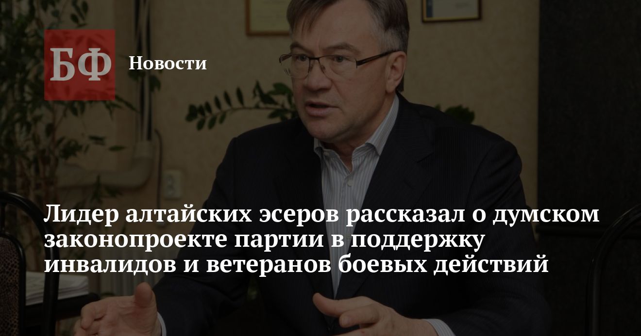 «Нынешний закон „О ветеранах“ нарушает права многих ветеранов боевых действий. Почему решили, что квартиры от государства могут получить только те, кто встал в очередь до 1 января 2005 года? Как быть остальным? Считаю, что временная граница установлена несправедливо. Наша фракция предлагает изменить законодательство так, чтобы все инвалиды и ветераны боевых действий могли получать социальное жилье без каких-либо ограничений», — пояснил депутат Государственной Думы и лидер алтайских социалистов Александр Терентьев.