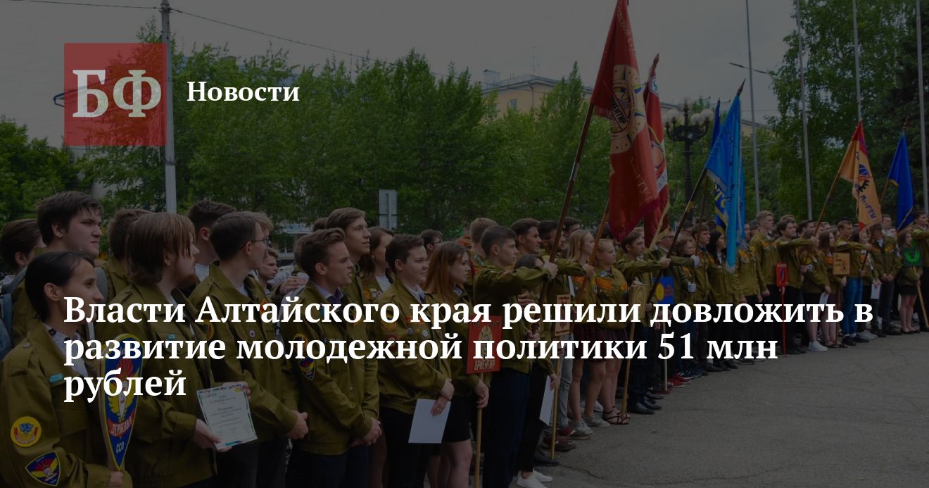 Счетная палата Алтайского края вынесла свое заключение по проекту постановления регионального правительства о внесении изменений в государственную краевую программу «Развитие молодежной политики в Алтайском крае», которое в ведомство представило местное Управление молодежной политики и реализации программ общественного развития. Основные изменения предусматривают увеличение общего объема финансирования госпрограммы на 50,831 млн рублей (14,7%) — с 345,958 млн до 396,79 млн рублей.