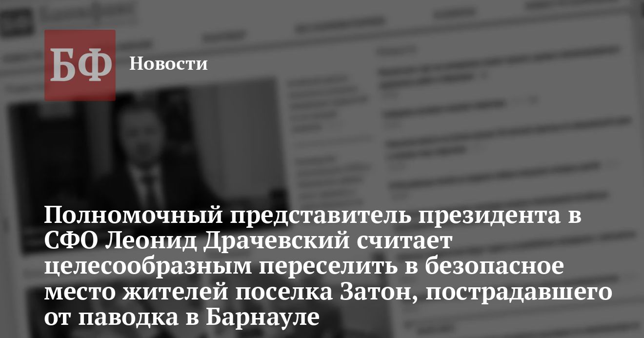 Полномочный представитель Президента РФ в Сибирском федеральном округе Леонид Драчевский считает целесообразным переселить в безопасное место часть жителей поселка Затон в Барнауле, пострадавшего весной в результате паводка.