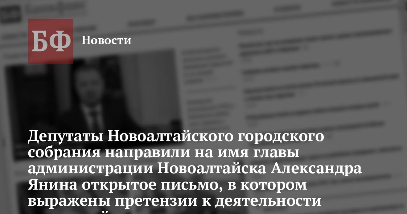 Как сообщил депутат Новоалтайского городского собрания, руководитель Новоалтайского отделения партии «Единство» Владимир Бычков, несколько депутатов собрания направили открытое письмо на имя мэра Новоалтайска Александра Янина. В письме в довольно резкой форме высказываются претензии к деятельности Янина на посту главы городской администрации. Также в письме содержится целый ряд примеров, которые, по мнению депутатов, иллюстрируют халатное отношение Янина к исполняемым им обязанностям.