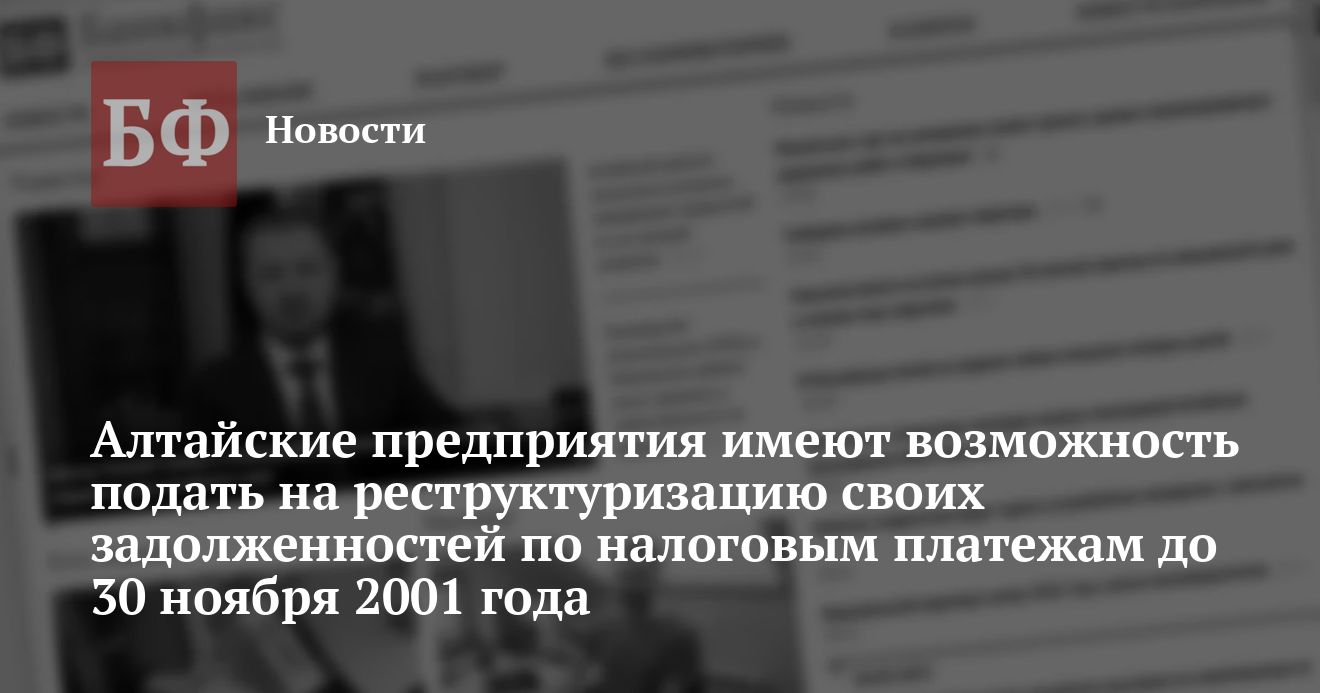 В УМНС по Алтайскому краю сообщили также о том, что первым алтайским предприятиям, подавшим заявление на реструктуризацию долга, стал завод «Ротор». Помимо «Ротора» еще несколько должников изъявили желание реструктуризировать свои долги, однако окончательное решение пока не вынесено ни по одному их них.