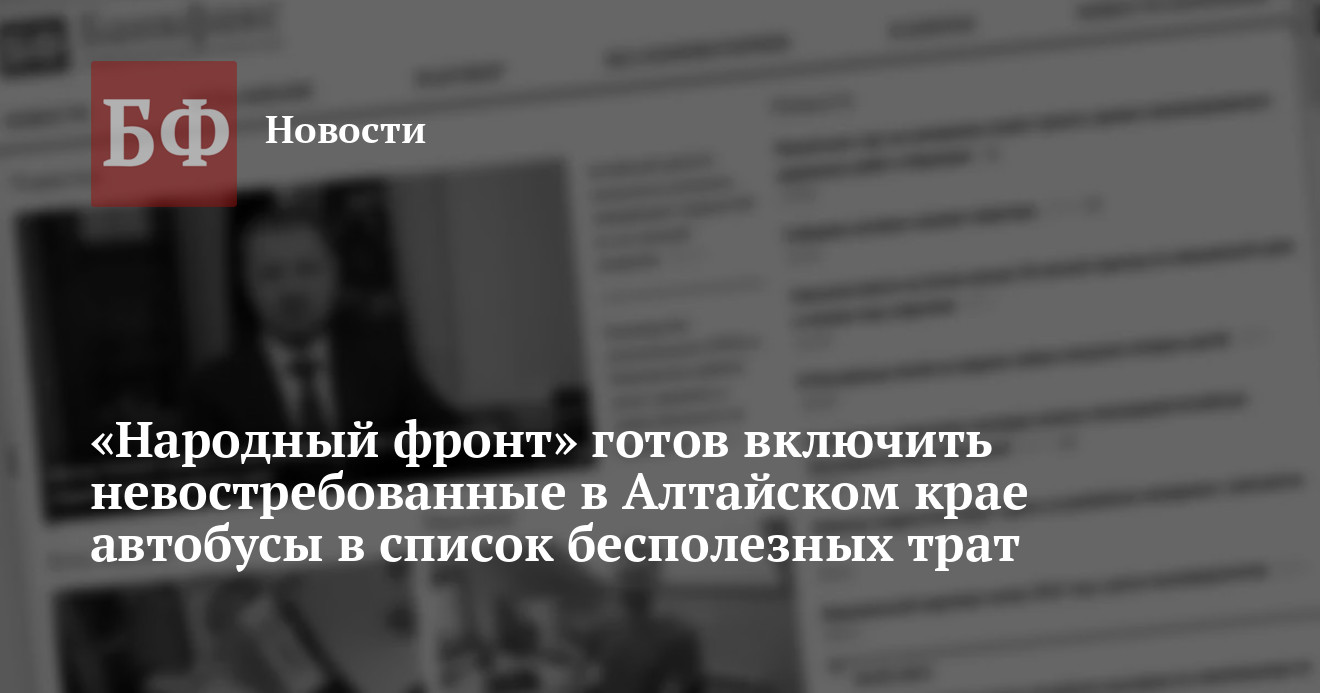 Также, по словам Войтюка, власти региона игнорировали предложения «фронтовиков» об использовании школьных автобусов для доставки жителей сел в районные больницы или ФАПы. В ОНФ ссылаются на опыт Калужской области. Там перевозками школьников и граждан, которым нужна медицинская помощь, занимается государственное казенное учреждение «Школьный автобус». «Народный фронт» считает, что подобную организацию следовало бы создать и на Алтае. Это особенно актуально для региона в связи с реализацией программы по модернизации первичного звена здравоохранения, которая предполагает строительство новых медицинских учреждений. Если же транспортная проблема в районах решена не будет, реформа тоже рискует оказаться бесполезной, полагают в ОНФ.