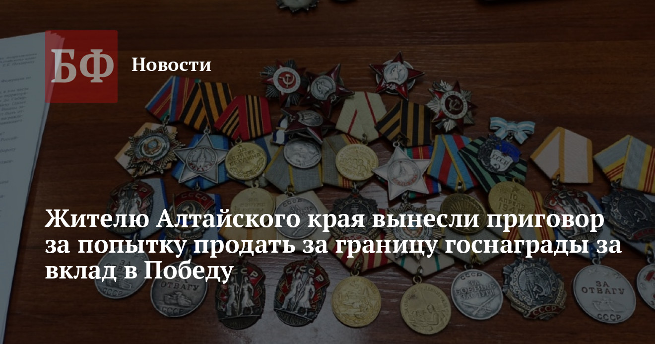 Судом установлено, что обвиняемый незаконно приобрел 33 государственные награды СССР, в числе которых ордена «Дружбы народов», «Знак почета», «Трудовой славы» III степени, «Отечественной войны», медали «За отвагу», «За оборону Ленинграда», «За оборону Сталинграда», «За оборону Москвы», «За взятие Кенигсберга», «За взятие Берлина», «За освобождение Варшавы» и другие, а также удостоверения к ним. Далее на одной из торговых площадок в Сети он нашел иностранного покупателя, которому предложил приобрести данные награды с комплектом документов. После получения от покупателя средств в размере свыше 100 тысяч рублей он в нарушение действующего законодательства отправил указанные ценности за границу. Однако преступление не было доведено до конца, так как посылку изъяли сотрудники УФСБ России по Алтайскому краю в почтовом отделении Барнаула.