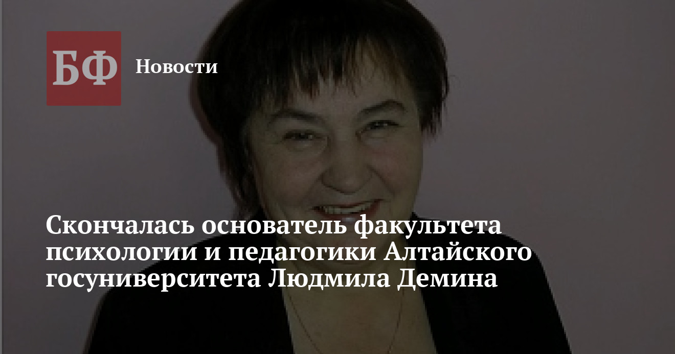 Именно университету, как поясняют в АлтГУ, Людмила Демина посвятила самые плодотворные годы своей жизни. Здесь она проработала около 40 лет. В 2003 году основала факультет психологии и философии. «Людмила Денисовна оставила после себя большое число учеников. Коллеги отмечают ее огромную работоспособность, научный энтузиазм. Она всегда была примером стойкости и профессионализма», — отзываются о Людмиле Деминой в университете.