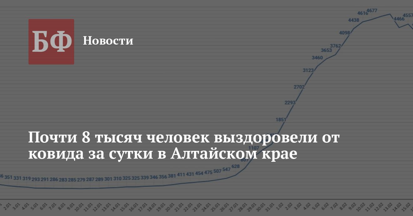 17 февраля в крае было зарегистрировано 4246 положительных тестов на COVID-19. Барнаул — 2360, Бийск — 140, Камень-на-Оби — 110, Заринск — 102, Рубцовск — 87, Славгород — 84, Солонешенский, Тальменский районы — по 38, Кулундинский район — 34, Топчихинский район — 35, Павловский, Михайловский районы — по 33, Родинский, Смоленский, Тюменцевский районы — по 32, Угловский район — 31, Завьяловский, Красногорский, Первомайский районы — по 30, Алейский, Тогульский Немецкий национальный районы — по 29, Шипуновский район — 28, Калманский, Рубцовский, Советский районы — по 27, Благовещенский, Змеиногорский районы — по 26, Зональный, Мамонтовский, Косихинский районы — по 25, Алтайский, Новочихинский, Табунский районы — по 24, Заринский, Ребрихинский, Усть-Калманский, Романовский районы — по 23, Алейск, Бийский, Бурлинский, Суетский, Третьяковский районы — 22, Егорьевский, Каменский районы — по 21, Ключевский, Локтевский, Троицкий, Поспелихинский, Шелаболихинский районы — 20, Быстроистокский район — 19, Усть-Пристанский район — 18, Залесовский, Панкрушихинский районы — по 17, Курьинский, Целинный, районы — по 16, Краснощековский, Петропавловский, Хабарский, Чарышский районы — по 14, Кытмановский район — 12, Волчихинский район — девять, Баевский район — шесть, Солтонский район — пять, Новоалтайск — два, Белокуриха, Ельцовский, Крутихинский районы — по одному.