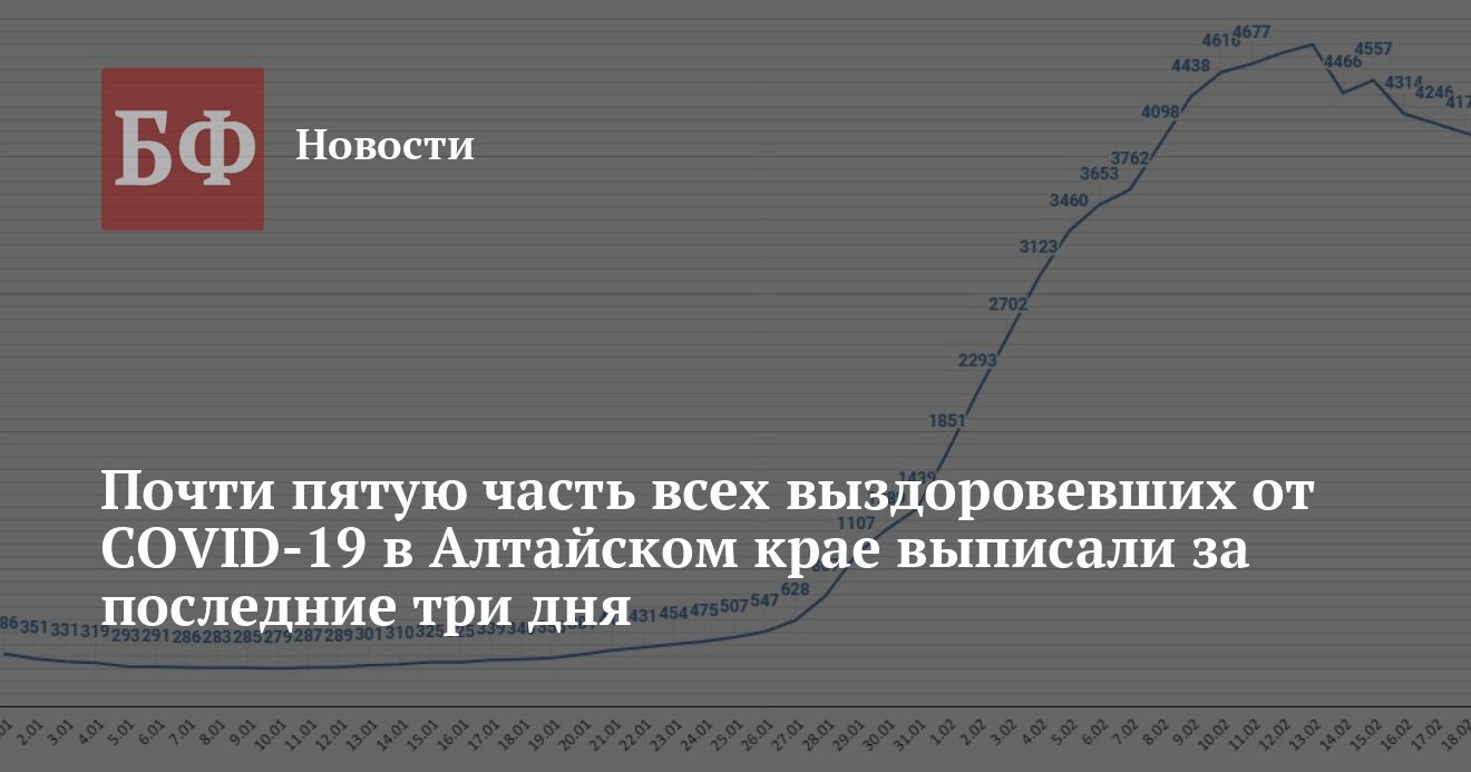 Из 12 188 новых случаев заражения 4175 выявили 18 февраля, 4113 — 19 февраля, а ровно 3900 — 20 февраля. Бесспорным лидером по этому показателю остается Барнаул, где за трое суток обнаружили 5643 заболевших. В общей сложности за все время пандемии в Алтайском крае выявили 212 263 случаев заражения. Выздоровели 165 916 человек. Отметим, что только за прошедшие три дня к категории выздоровевших причислили 29 670 человек. Это 17,8% от числа выздоровевших за все то время, что в крае распространяется коронавирус, то есть почти за два года. Также за упомянутый период в три дня была зарегистрирована 61 смерть среди инфицированных. Всего погибло 9258 человек, из них 7786 скончались непосредственно от COVID-19, а 1472 — по иным причинам.
