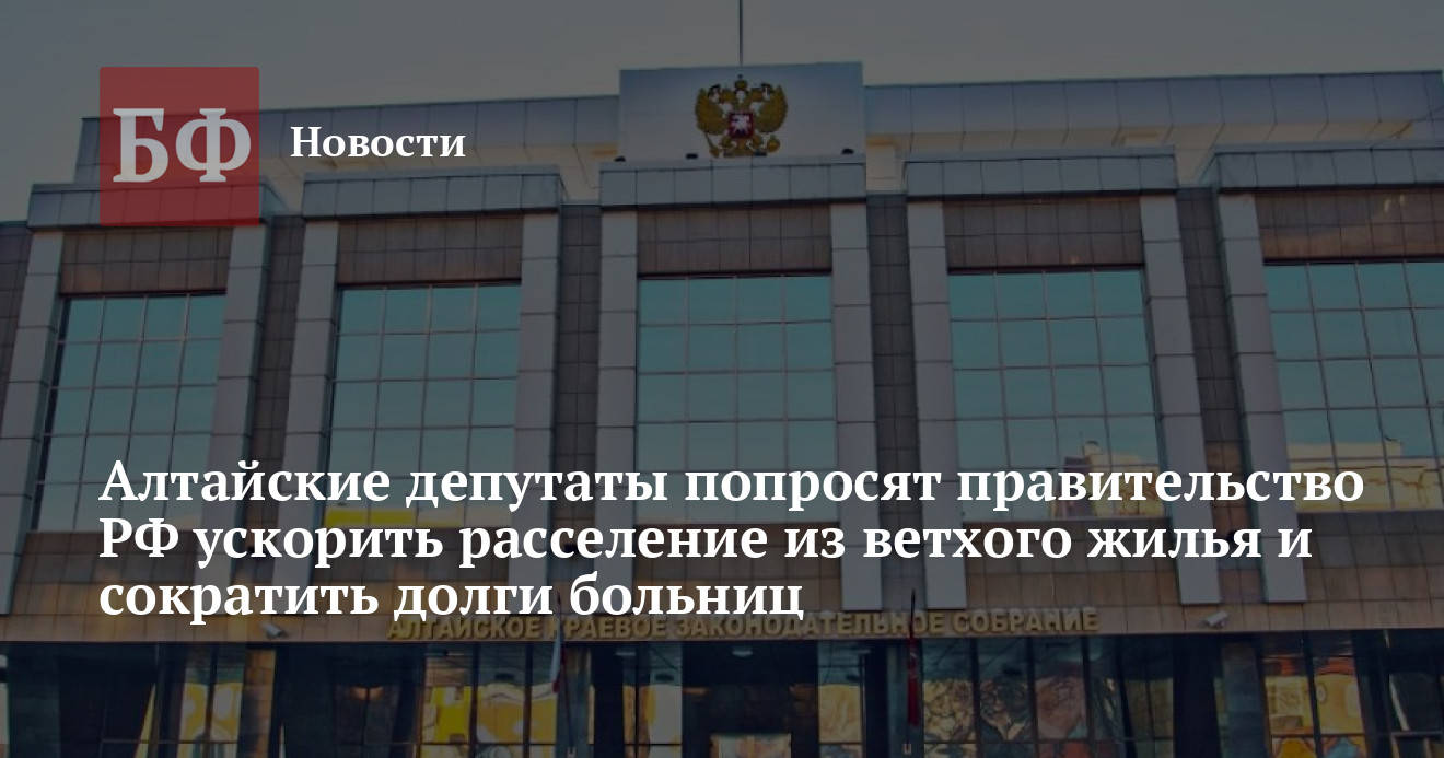 В Алтайском краевом Законодательном Собрании инициировали обращение в правительство РФ по вопросам ветхого и аварийного жилья, а также кредиторской задолженности медицинских организаций. Такая инициатива была озвучена 24 февраля на заседании фракции «Единой России». По мнению народных избранников, предложенные меры помогут ускорить темпы расселения и сократить долги перед организациями. Соответствующие документы могут внести на сессию АКЗС уже в марте, сообщает пресс-служба парламентского центра.