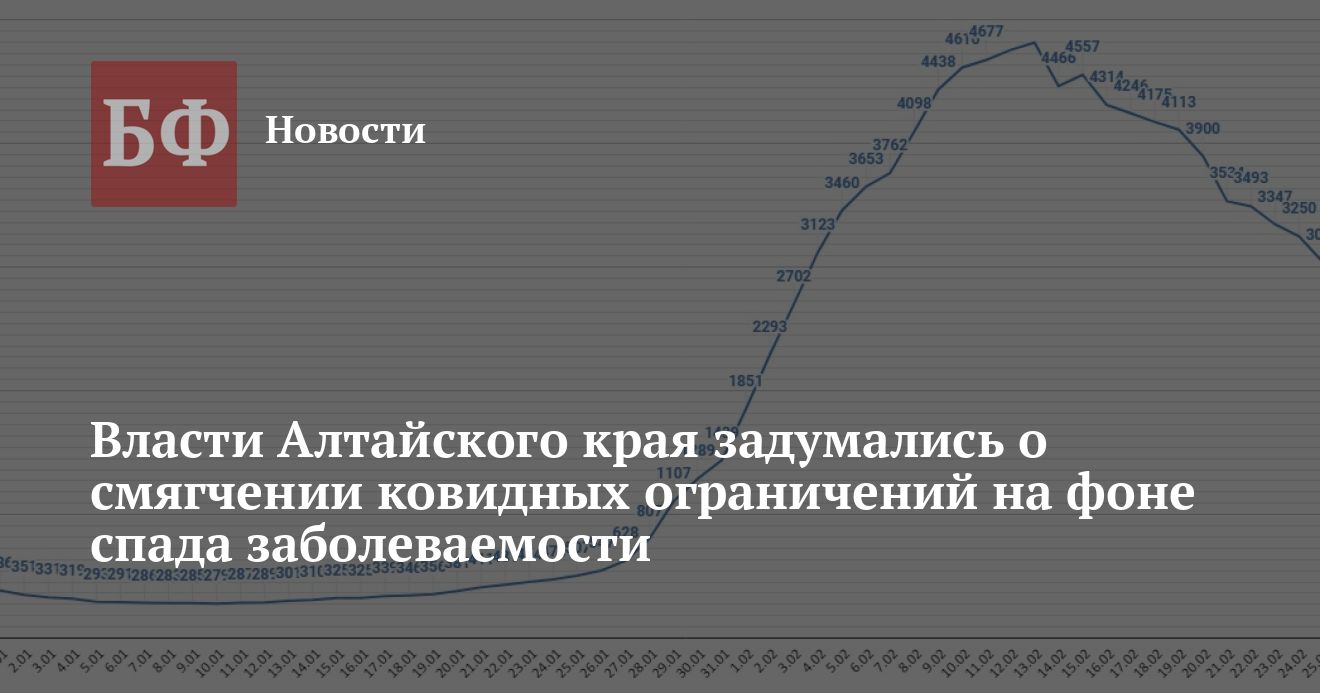 Отметим, что по данным правительственного Telegram-канала «Ленина, 59», 28 февраля прошло аппаратное совещание в краевом правительстве, где министр здравоохранения региона Дмитрий Попов рассказывал о снижении заболеваемости. По информации администраторов, он отметил, что особенностью этой волны стало отсутствие так называемого плато — заболеваемость после достижения пика просто резко пошла вниз. Учитывая обстановку, ожидается, что в Алтайском крае уже на этой неделе могут существенно смягчить действующие коронавирусные ограничения.