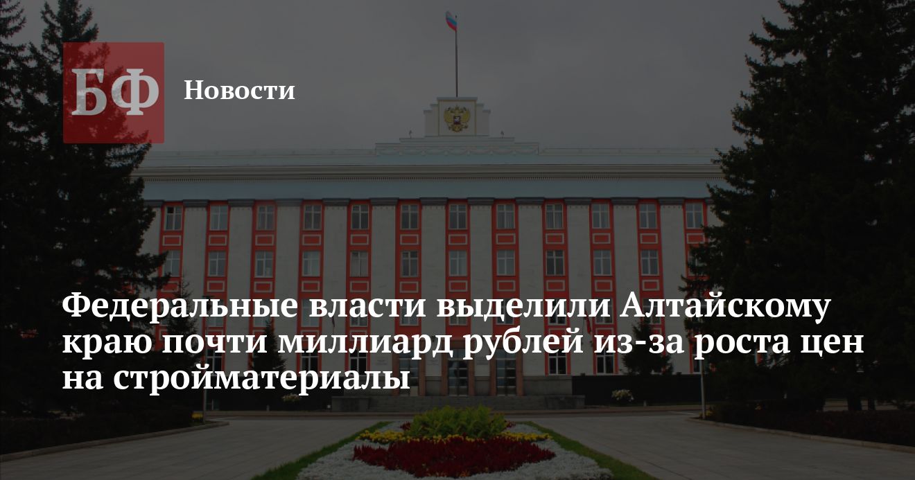 Алтайский край получит почти 1 млрд рублей из резервного фонда правительства РФ в связи с ростом цен на строительные ресурсы. Об этом сообщает пресс-служба краевого правительства. Несмотря на то, что федеральные чиновники приняли соответствующее решение совсем недавно, в крае уже решили, на что направить эти деньги. Судя по риторике местных властей, транш частично пойдет и на устранение претензий Генпрокуратуры РФ, которую не устроили темпы сдачи образовательных объектов по нацпроекту «Демография».