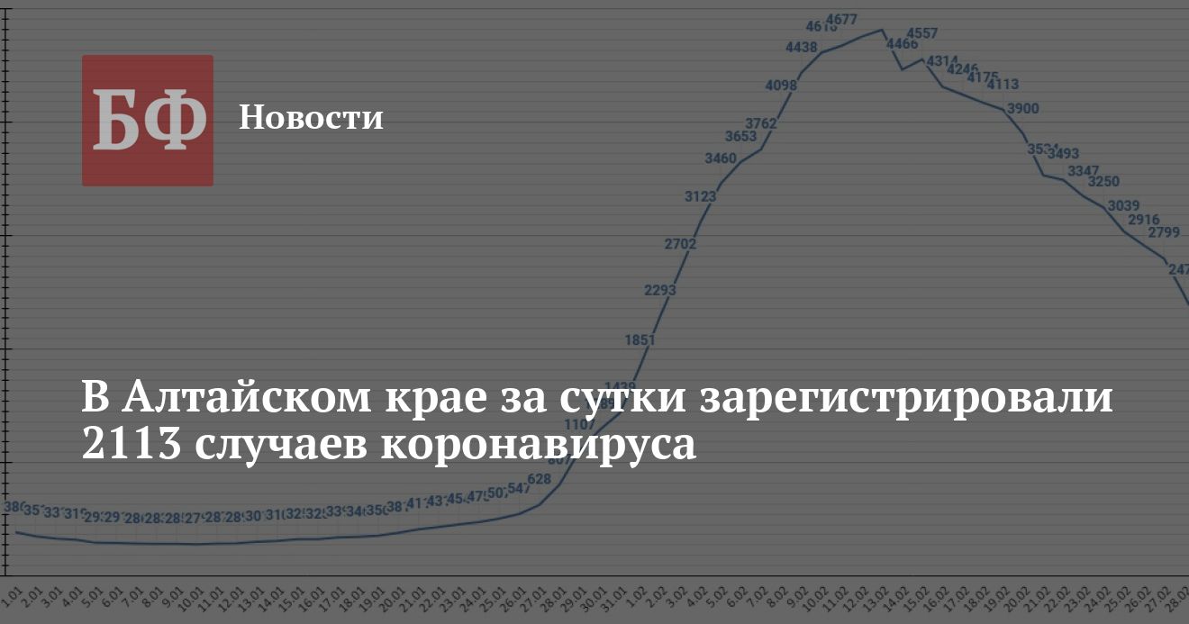 2 марта в регионе 2113 человек получили положительный результат теста на COVID-19. Большинство случаев зарегистрировали в Барнауле — 633, Камне-на-Оби — 56, Бийске — 83 и Рубцовске — 54. Общее число выявленных за все время зараженных достигло 239 230. За сутки выздоровело 4434 граждан, а за все время — 209 420.