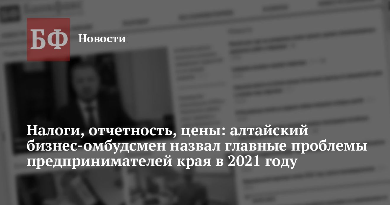 Основные трудности бизнесменов Алтайского края связаны с высокими налогами и другими видами финансовой нагрузки, а также ростом цен на многие виды товаров и материалов. Об этом в своем докладе об итогах работы в 2021 году рассказал уполномоченный по правам предпринимателей в регионе Андрей Осипов, сообщается на сайте профильного управления.