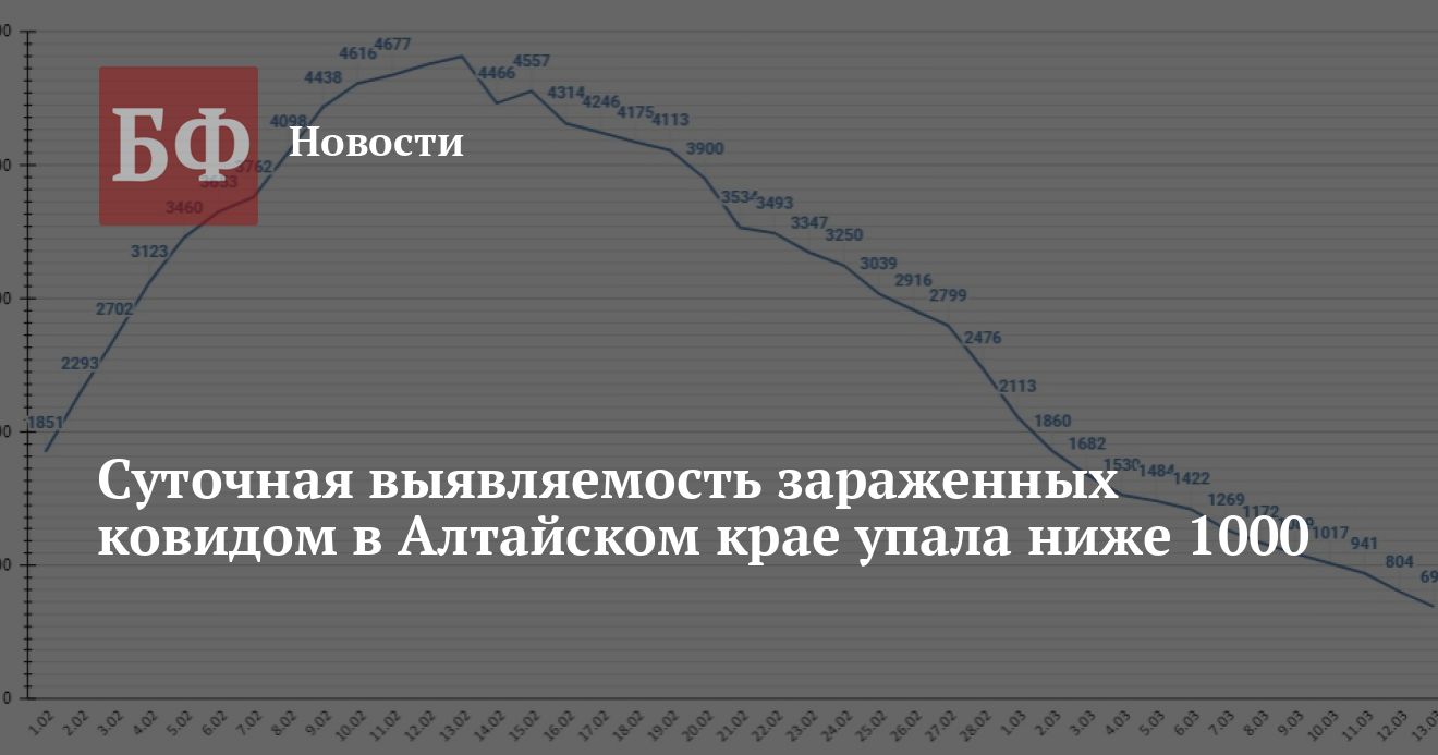 В период с 11 по 13 марта в регионе зафиксировали 2436 положительных результата тестов на COVID-19. 11 марта впервые с 28 января показатель прироста зараженных упал ниже 1000 и достиг 941, а 13 марта он составил 691. За три дня в Барнауле выявили 702 инфицированных, в Бийске — 107, в Рубцовске — 82. За всю пандемию в крае было 254 191 заболевших. В течение трех суток выздоровело 4476 граждан, а за все время — 234 711.