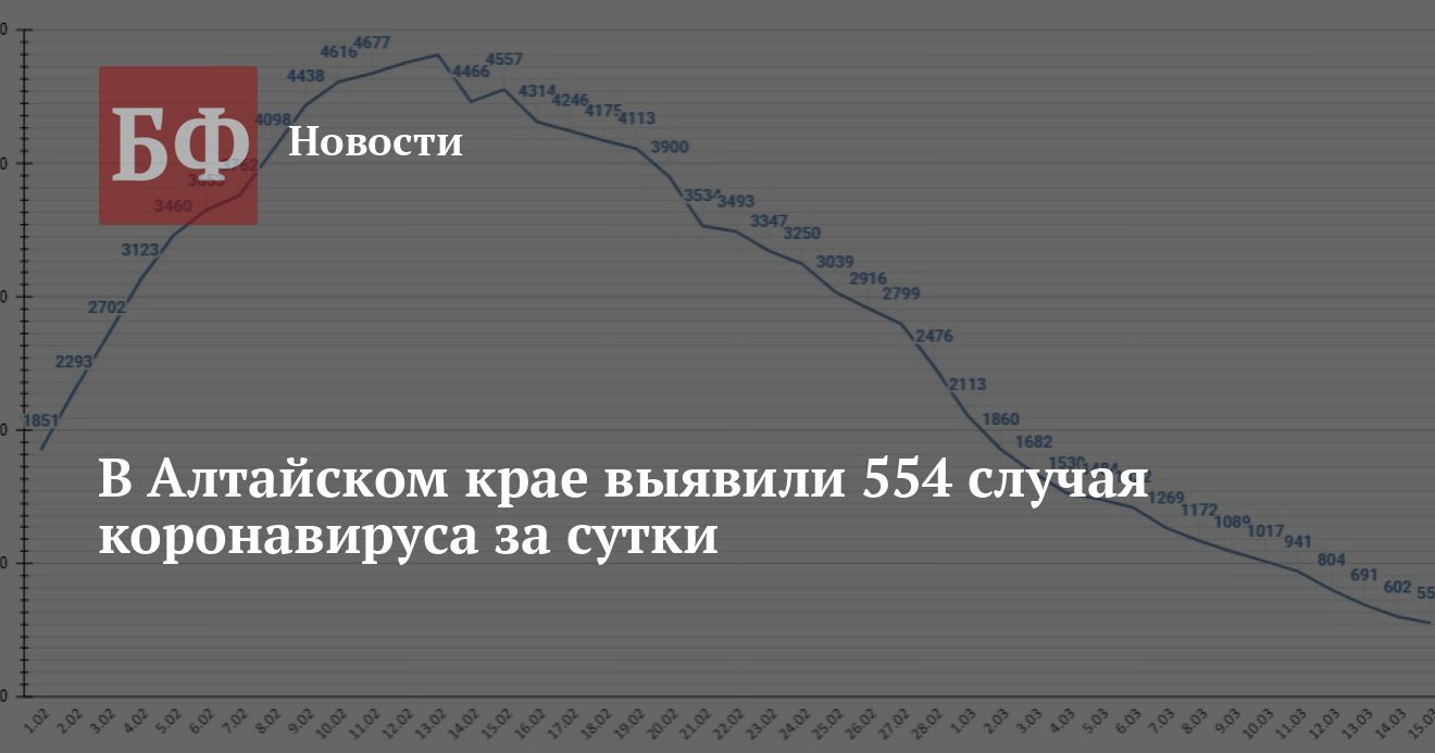 15 марта в регионе нашли 554 ковид-инфицированных. Большинство случаев обнаружили в Барнауле — 162, Бийске — 30, Новоалтайске — 20. Общее число зафиксированных зараженных достигло 255 347. За сутки выздоровело 308 человек, а за все время 235 754.