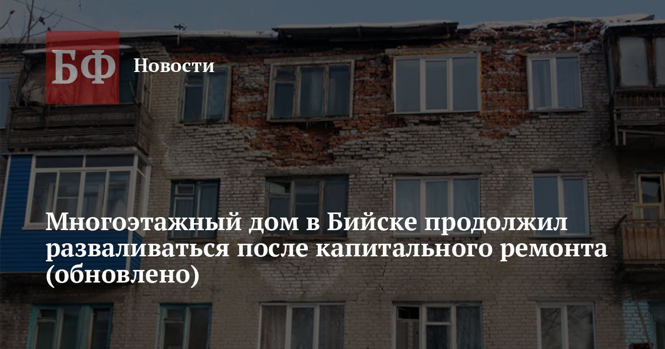 UPD: Как уточнили в Минстрое Алтайского края, в2017 году дом признали аварийным. В 2017—2018 годах были проведены аварийно-восстановительные работы за счет резервного фонда города Бийска на сумму 8 млн, на основании этого дом лишился статуса аварийного. В 2019 году его исключили из краевой программы, а в 2020 году по обращению Минстроя МКУ «Управление ЖКХ Бийска» провело визуальный осмотр — недостатки работ подрядной организации не выявлены. Жители дома с этим не согласились, поэтому им было рекомендовано обратиться в суд. В 2017 году в рамках краевой программы за счет регоператора был проведен капитальный ремонт крыши дома стоимостью 3,9 млн рублей. Вместе с тем, задолженность перед Регоператором у собственников квартир составляет 3,7 млн рублей. В настоящее время дом находится в краевой программе. Таким образом, жалоб на крышу, отремонтированную по краевой программе капремонта, у жильцов дома нет. Вопросы у граждан именно к реконструкции, проведенной администрацией Бийска, констатировали в региональном ведомстве.