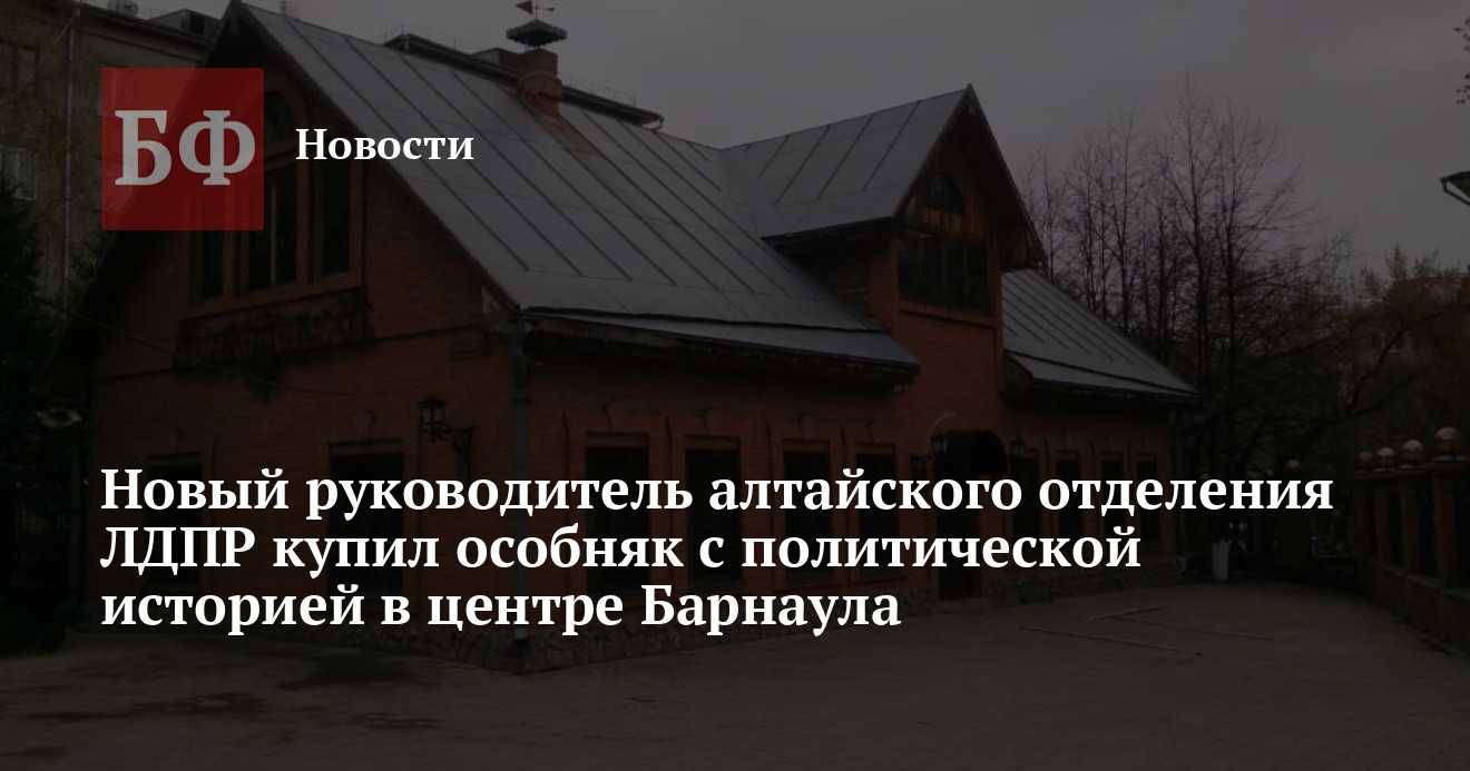 Руководитель Алтайского регионального отделения ЛДПР Сергей Булаев приобрел участок земли с размещенным на нем особняком. Объект находится в Барнауле на улице Папанинцев, 76 «А», прямо напротив ЦУМа. Как сообщает «Толк», ранее участок со строением, которое в определенных кругах приобрело статус легендарного, принадлежал ООО «Барнаульская сетевая компания».