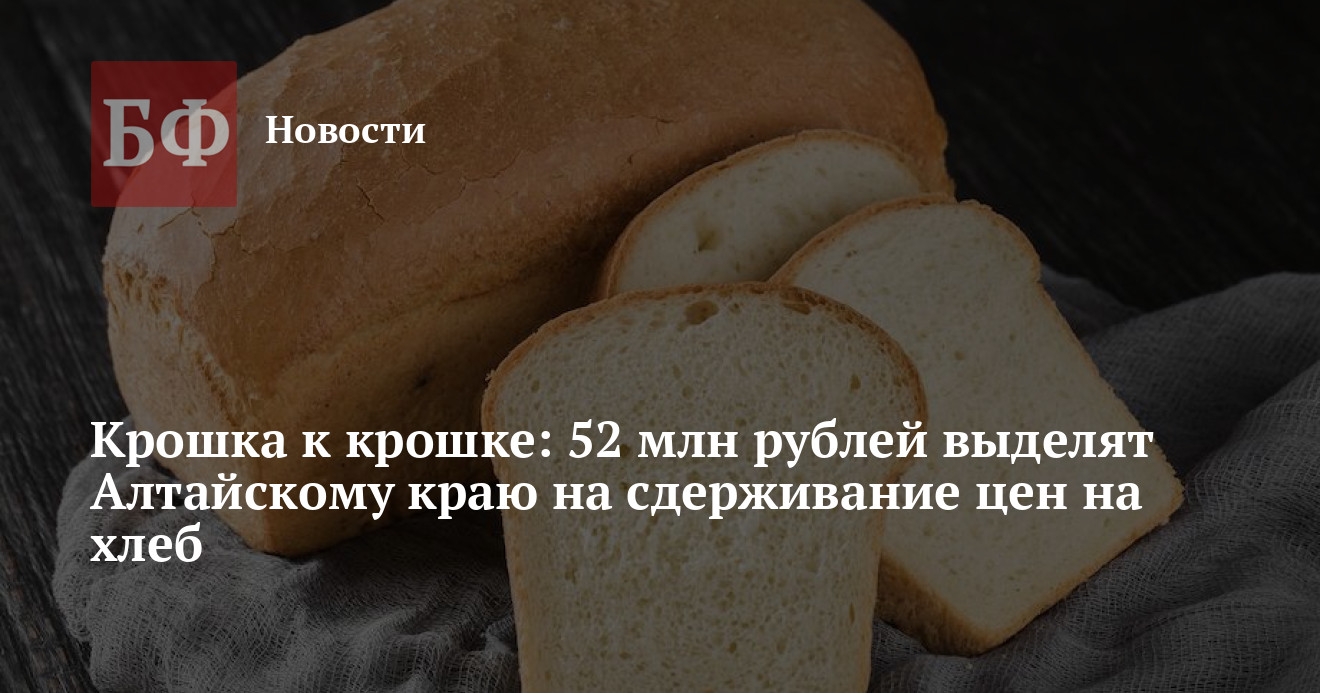 Правительство РФ определило сумму, которую получит Алтайский край из федерального бюджета для сдерживания цен на хлеб и хлебобулочные изделия. Как сообщает Алтайпищепром, государство выделит региону около 52,2 млн рублей. Ранее глава ведомства Александр Большаков предполагал, что сумма будет меньше — около 43 млн рублей. Хлебопеки же называли такие финансовые вливания со стороны бюджета недостаточными.