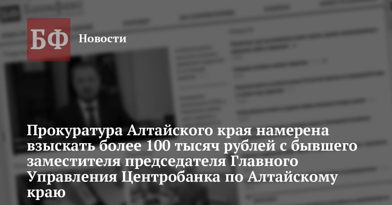 Прокуратура Алтайского края в ближайшие дни направит в суд иск о взыскании 102 тысяч рублей с бывшей заместителя председателя Главного управления Центробанка РФ по Алтайскому краю Людмилы Зайцевой.