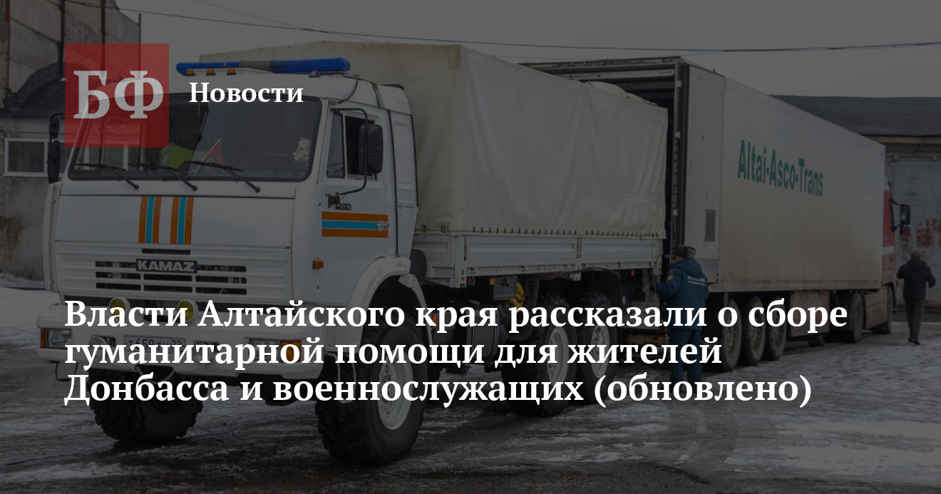 По информации властей, сбор гуманитарной помощи в крае ведется по нескольким направлениям. Необходимые продукты и вещи предоставляют различные предприятия, общественные организации и жители региона. «Инициатив много, они самые разные. Кто-то хочет помочь военным, кто-то — беженцам, которые оказались на территории России, кто-то — мирным людям на Украине. Возможно, кто-то хочет помочь конкретным жителям, конкретным населенным пунктам. В любом случае вся координация деятельности должна быть за ГУ МЧС России по Алтайскому краю», — сказал губернатор Виктор Томенко.