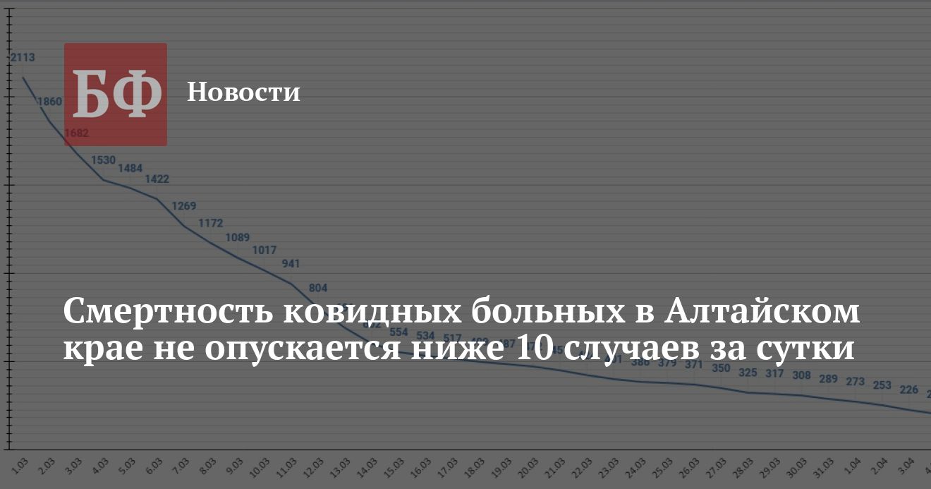 В Алтайском крае, несмотря на многократное уменьшение заболеваемости ковидом, смертность среди зараженных уже которую неделю подряд держится примерно на одном и том же уровне, не опускаясь ниже планки из 10 случаев за стуки. Как сообщает оперативный штаб региона в своем официальном Telegram-канале, за 4 апреля скончались 14 инфицированных.
