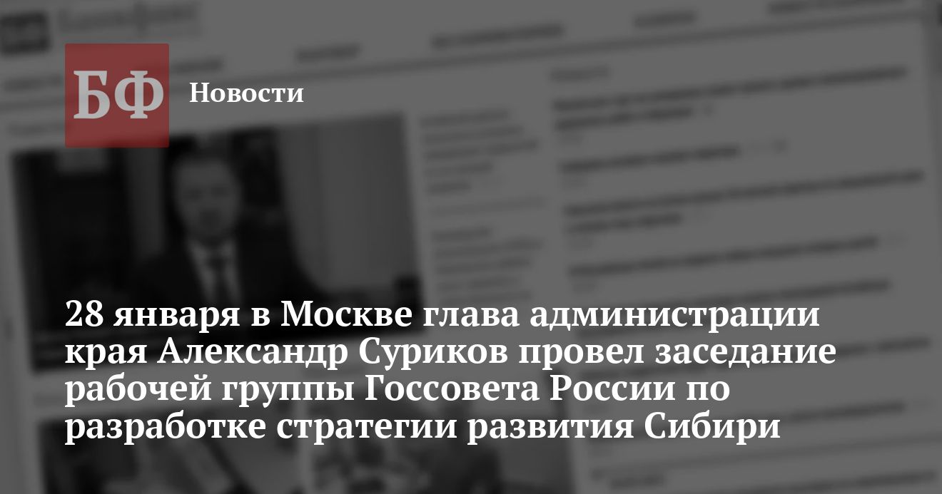 По мнению Александра Сурикова, это два разных региона с разными географическим положением, со своими стратегическими задачами и экономическими проблемами. И подход к решению их проблем не должен быть одинаковым. В связи с этим администрация Президента РФ предложила алтайскому губернатору возглавить рабочую группу с целью выработать в отношении проблем развития Сибири единую позицию на федеральном уровне. В совещании приняли участие начальник Экономического управления Президента РФ Антон Данилов-Данилян, главы администраций Томской и Омской областей, заместитель губернатора Красноярского края, министр энергетики Игорь Юсуфов, а также заместители министров финансов, транспорта, экономического развития и торговли, другие руководители.