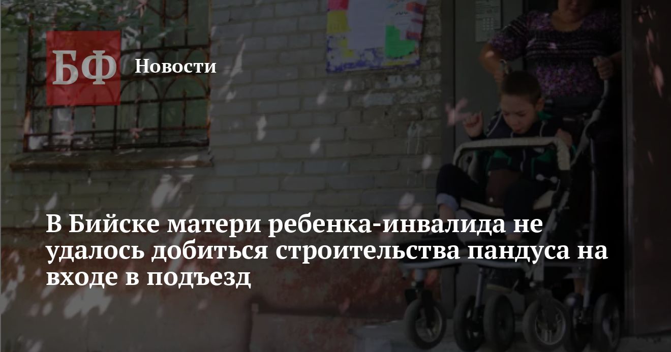 Жительница Бийска Алена Григорьева больше года не может добиться установки пандуса у входа в подъезд ее дома на улице Красноармейской, 71. Как пишет «Бийский рабочий», женщина воспитывает сына-инвалида, и по высоким ступенькам порога ей крайне неудобно возить ребенка в коляске. Чтобы как-то решить проблему, она обращалась к губернатору Виктору Томенко и главе Минсоцзащиты Наталье Оськиной. Но пока пандус не построили.