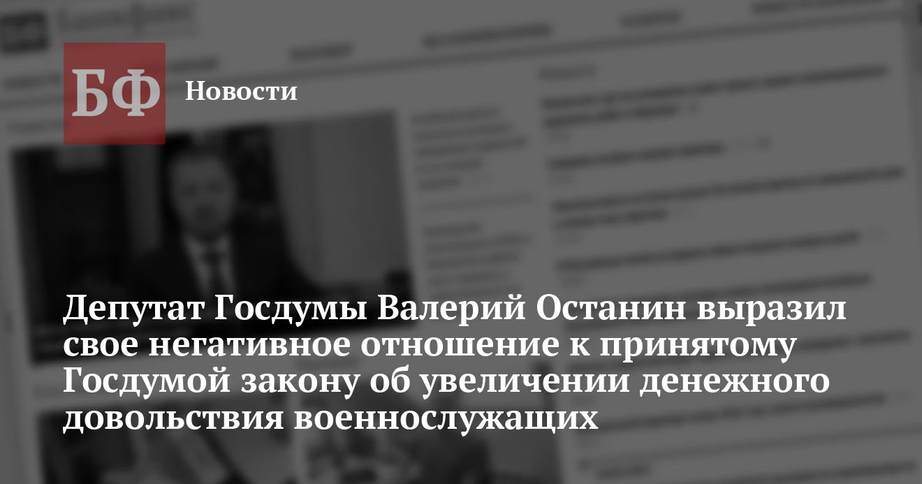 По мнению Останина, принятый Госдумой 15 марта правительственный вариант закона «О внесении изменений в некоторые законодательные акты РФ по вопросам денежного довольствия военнослужащих и предоставления им отдельных льгот» имеет несколько серьезных минусов. Во-первых, он в лучшем случае в полтора раза увеличивает денежное довольствие военнослужащих. «Учитывая темпы инфляции, все эти надбавки будут „съедены“ к 1 сентября», отметил депутат.