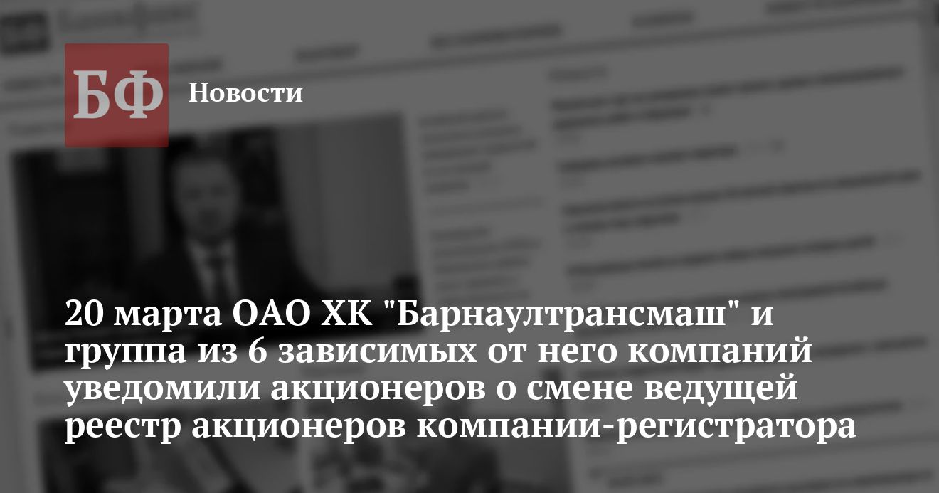 Советы директоров всех этих ОАО приняли решение о расторжении договора на ведение реестра акционеров с ООО «Акционер». В свою очередь, предприятия трансмашевского холдинга сообщили о заключении такого же договора с компанией-регистратором из г. Владимир ООО «Депозитарный центр». ООО «Акционер» будет ее трансфер-агентом в Барнауле и вести непосредственные отношения с акционерами.