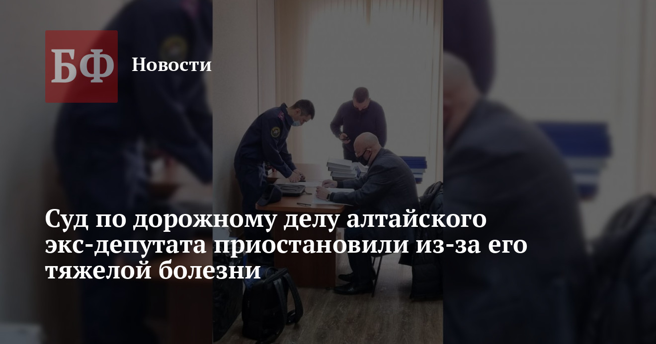 Горно-Алтайский городской суд приостановил производство по делу в отношении бывшего депутата республиканского парламента и экс-начальника «Горно-Алтайавтодора» Николая Нечаева. Как указано в судебной картотеке, обвиняемый тяжело болен. По сведениям ИА «Банкфакс», в настоящий момент он находится в Москве и готовится к операции.